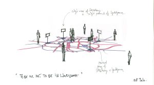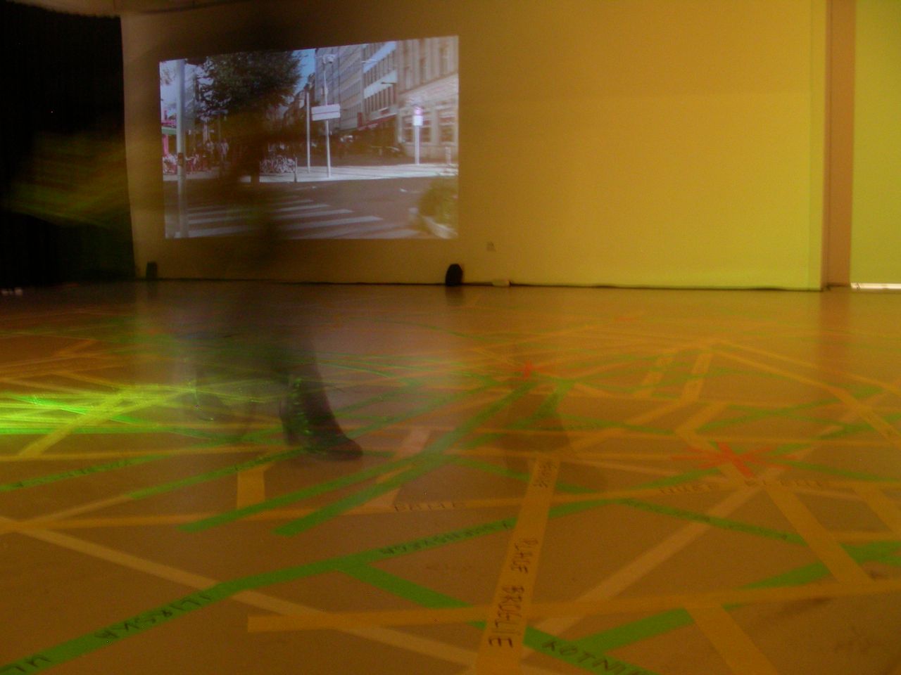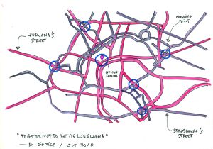 To be or not to be (in) Ljubljana is an abstract storytelling of a personal event, one other title would be To be or not to be (in) Strasburg. Until this summer I lived in Paris, now I am installed in Strasburg where I was yet living thirteen years ago, a strange come back that I never thought possible before. I know all the part of my new-old city, perhaps to much. Living virtualy in Ljubljana, a total unknowed city for me, is a way to play and enlarge my perception of Strasburg, being here and being there in the same time. The installation To be or not to be (in) Ljubljana is a spatial transcription of this virtual vital game and an haphazard way to discover Ljubljana, mixing views of Strasburg on sounds of Ljubljana. The playground is made with the overlayed maps of the 2 cities, adjusted on the google’s city marker (it would be in a past time church or town hall, real references). The rule of the game is to choose different places in Strasburg for video shooting after mixed on the corresponding points on the Ljubljana’s map with a sound recording and an oral description of the real place found. Spectator of the installation is included in the game, walking on the real-virtual mixed map, visiting two cities in the same space and time.