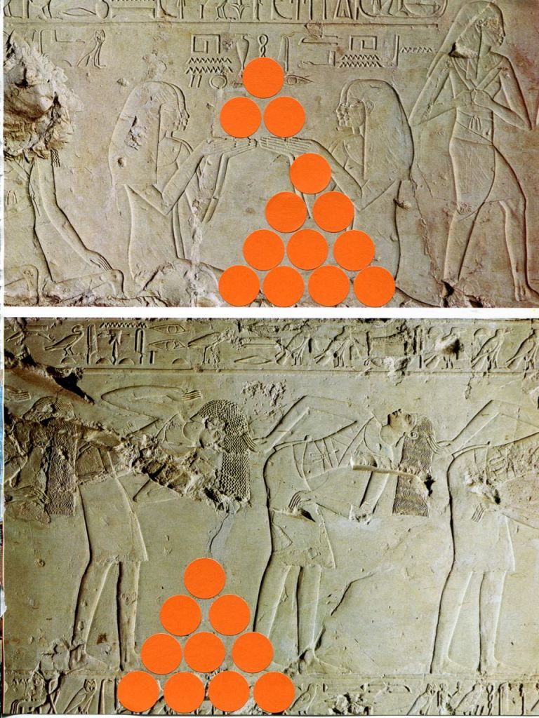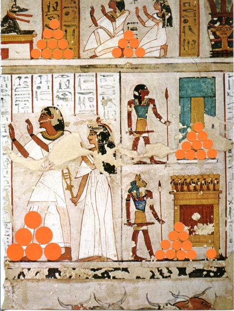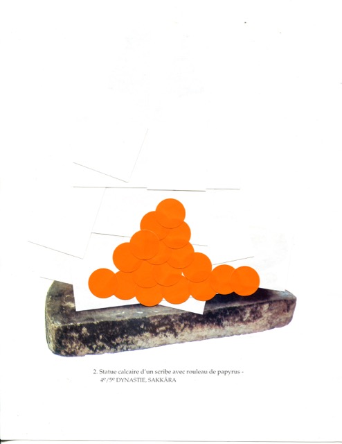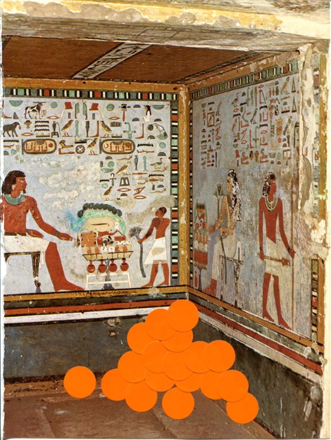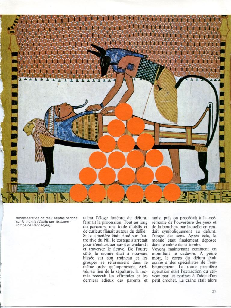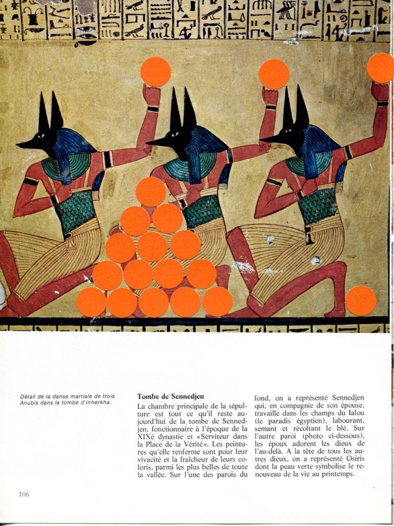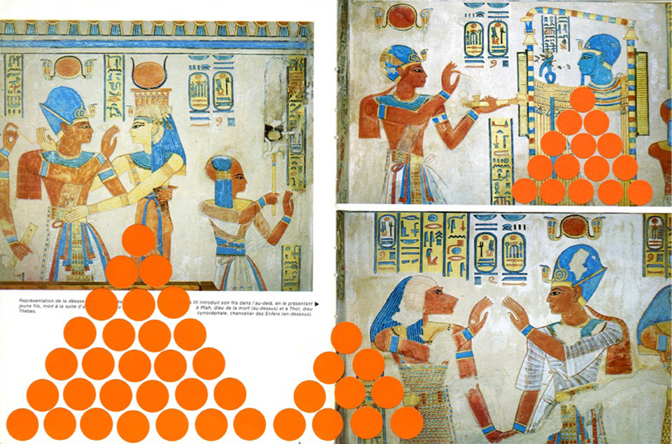 OFFERING / gommettes sur pages imprimées / tentative de lien temporel entre l’Egypte antique et maintenant, offrandes virtuelles déposées sur la page au-delà des siècles, en y pensant très fort