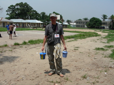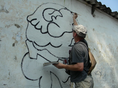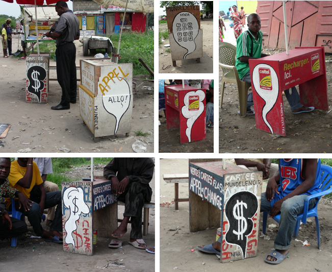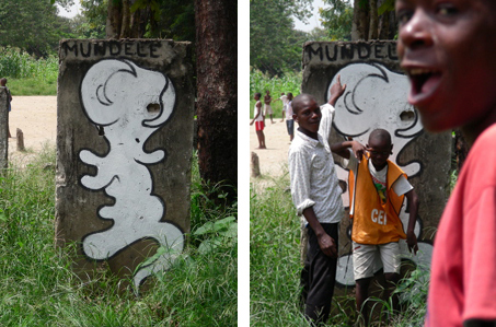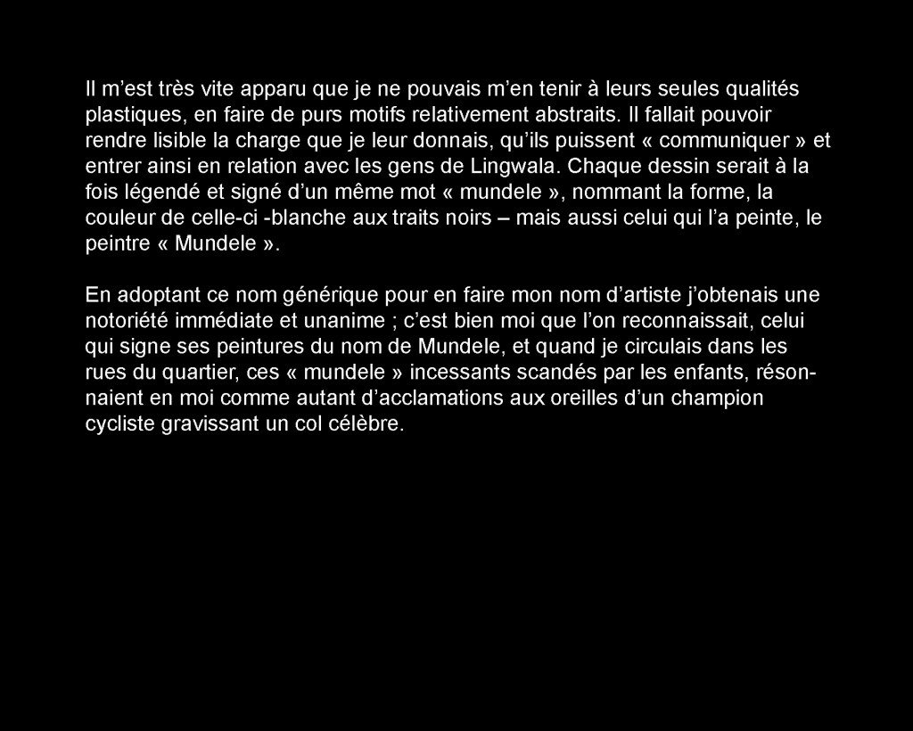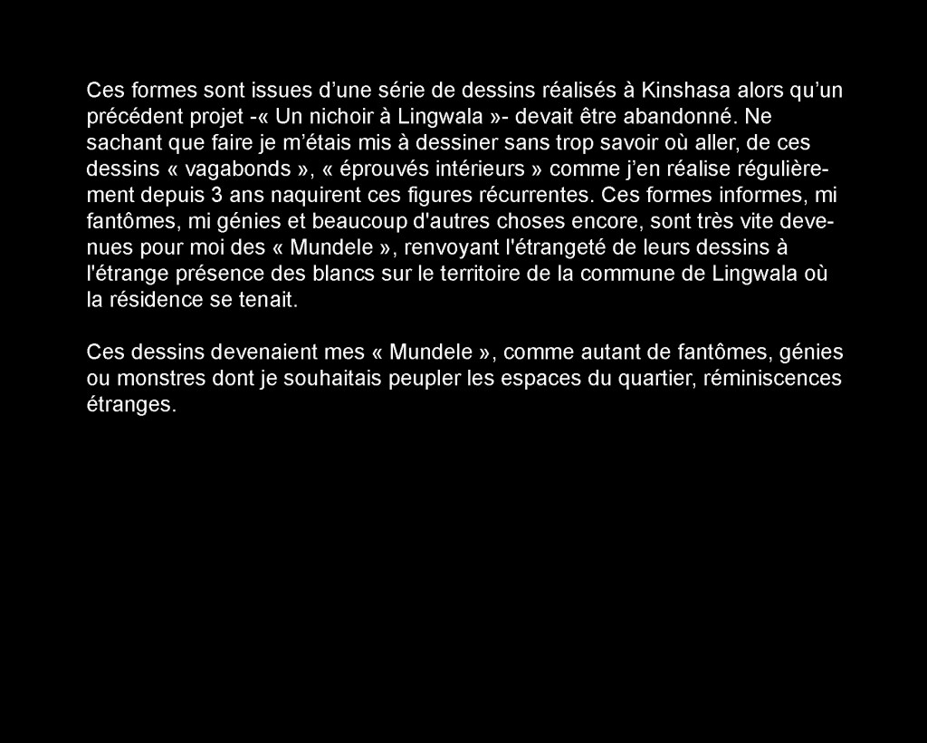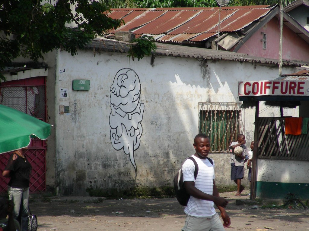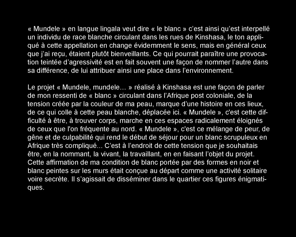 J’ai commencé à circuler dans le quartier avec un seau de peinture, une tenue de peintre, des images plastifiées autour du cou. Je proposais aux gens de leur peindre un « mundele » ( ce qui veut dire blanc en Lingala, à Kin, dès qu’un blanc circule, il est interpellé « mundele, mundele ! ») sur les murs de leur parcelle, stand, etc. Aucune transaction d’argent, juste un échange. Et du dialogue. // I then started to walk inside the area with a seal of painting, and a costume of painter, badges around his neck. I was proposing people to paint a « mundele » (it means white in Lingala and in Kin at the moment a white person is circulating, people call out « mundele, mundele ! ») on the walls of theirs parcels, stands, etc. No money transaction, just an exchange. And dialog.