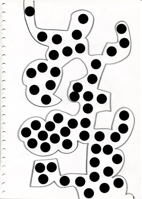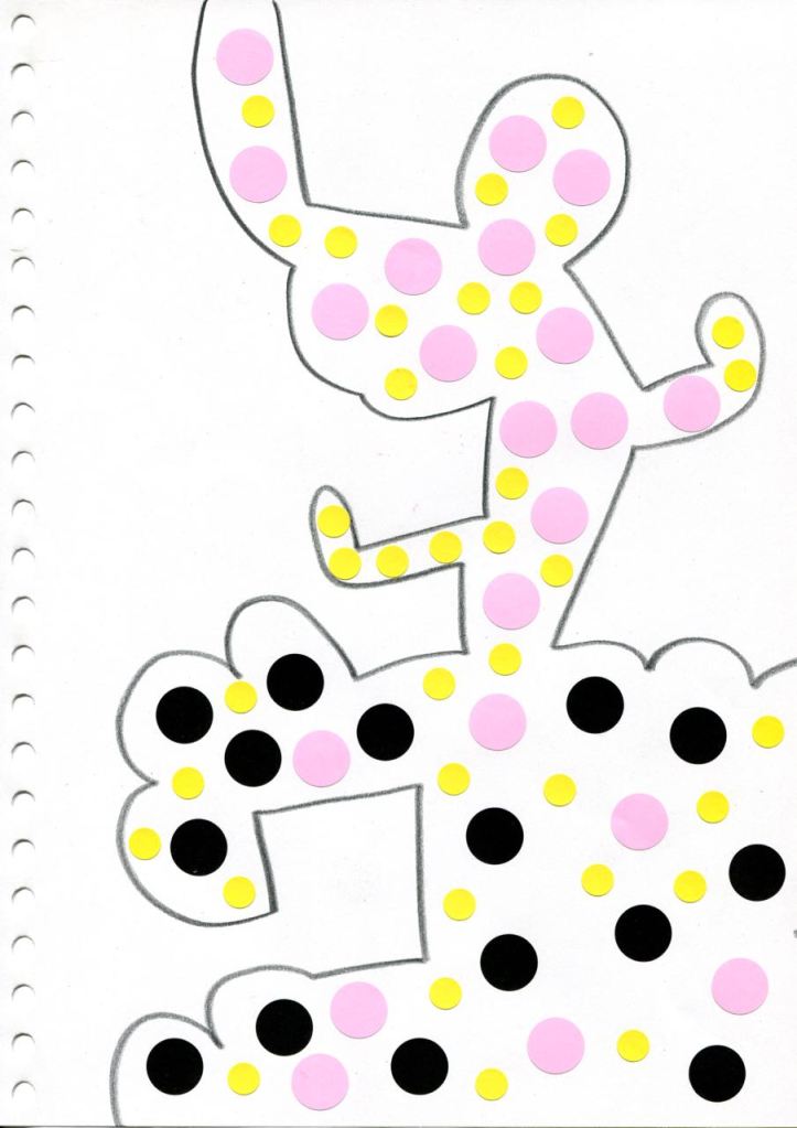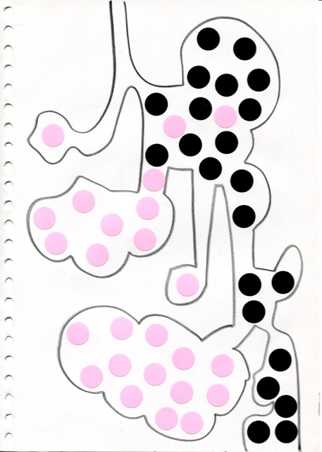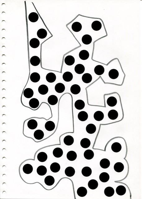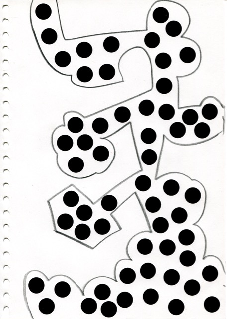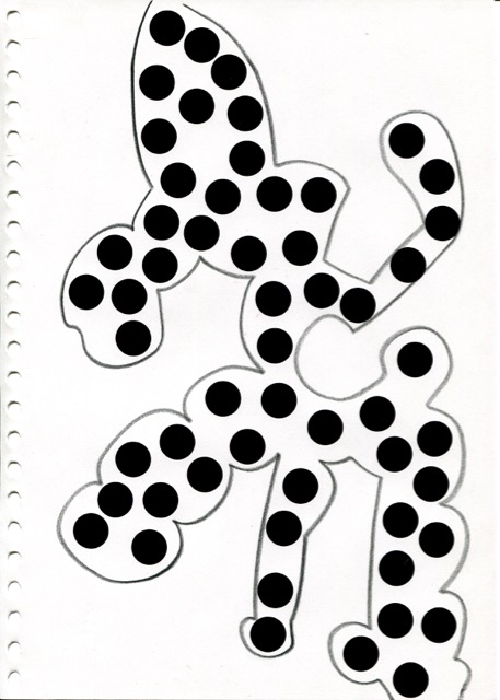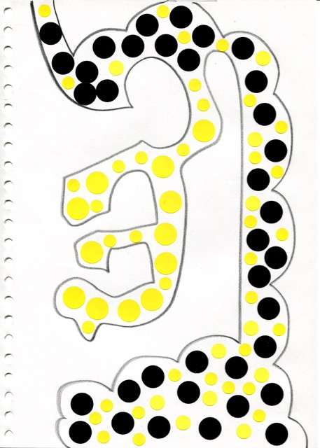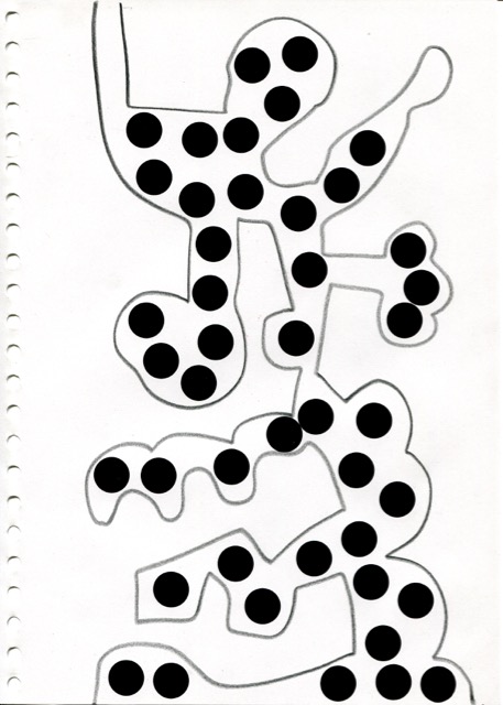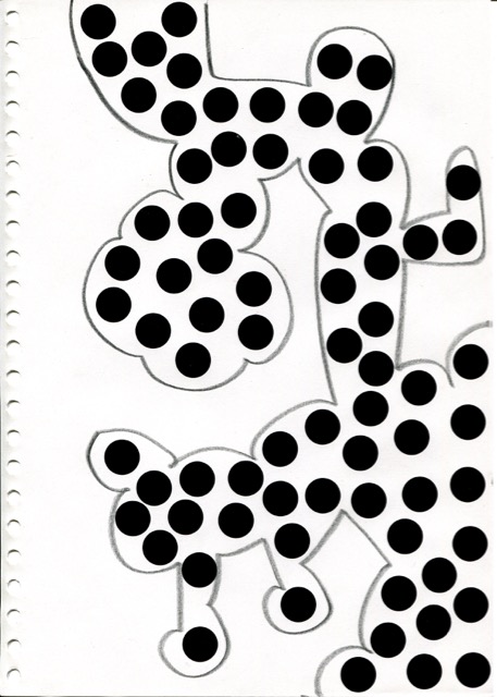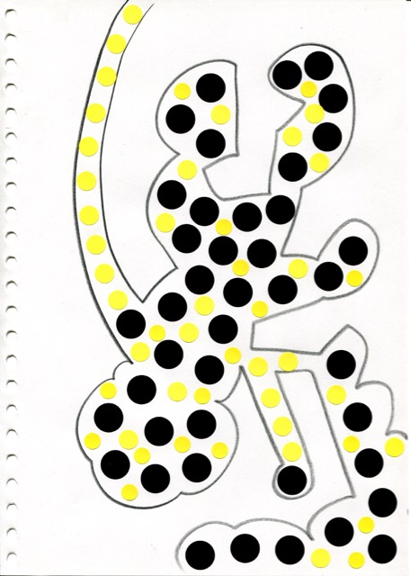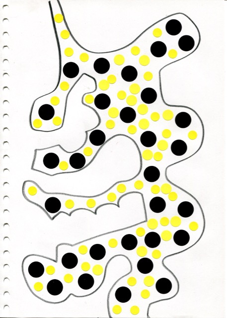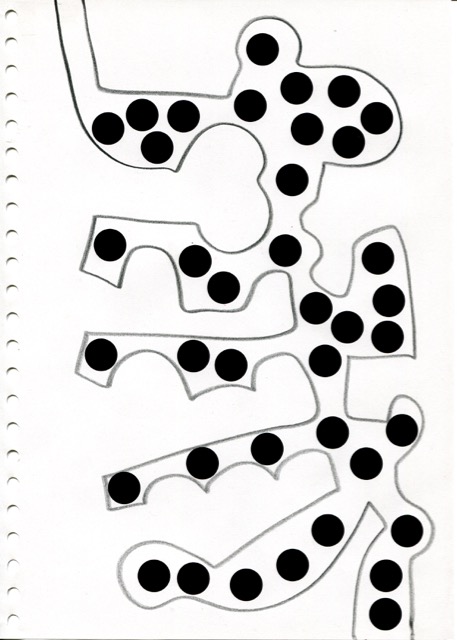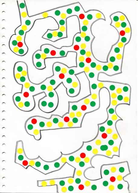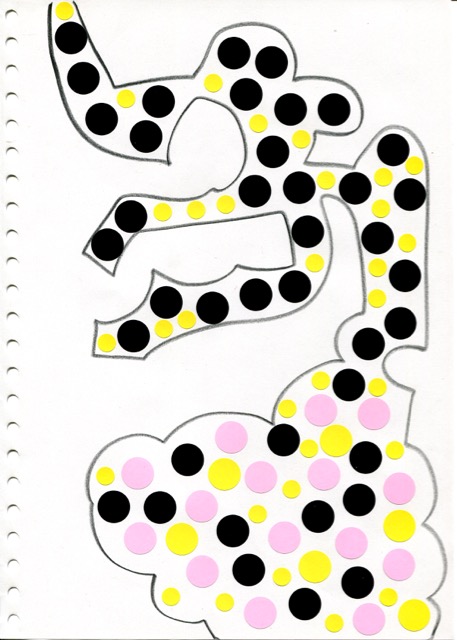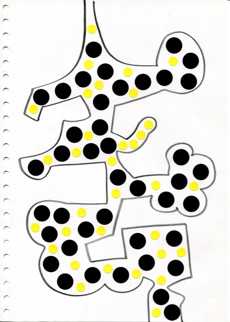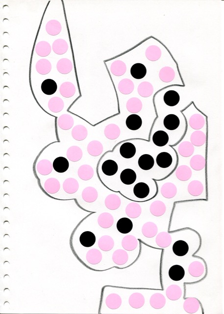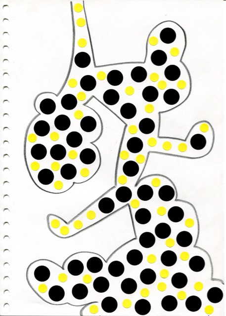 dessins à la mine noire sur papier et gommettes