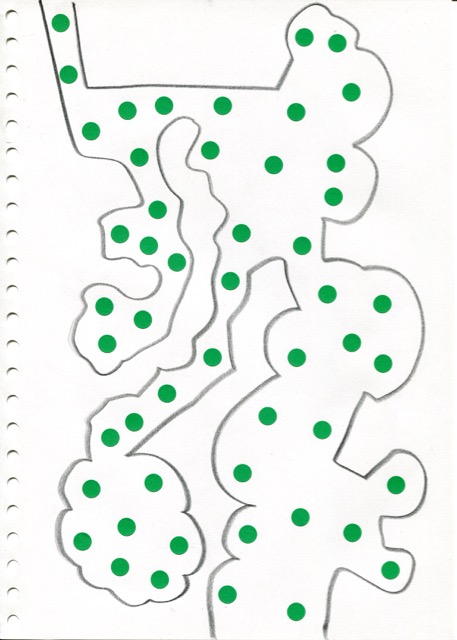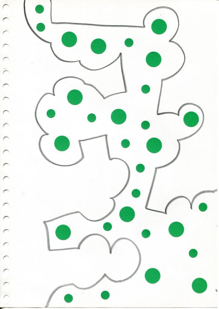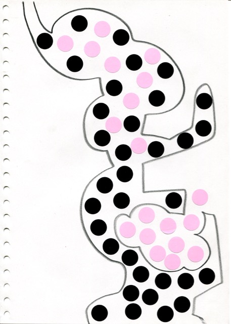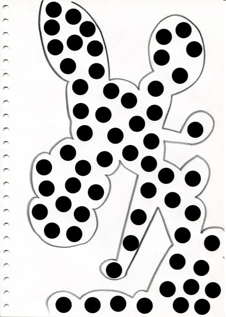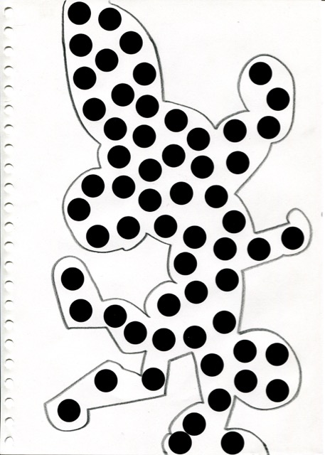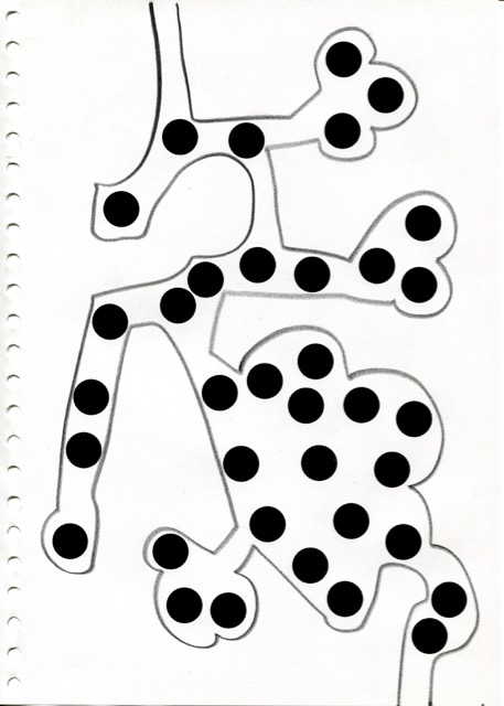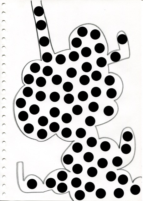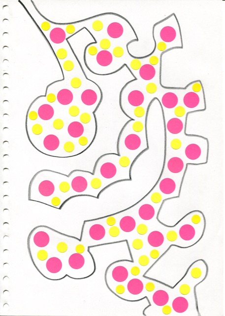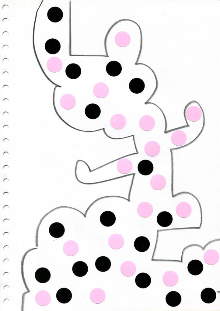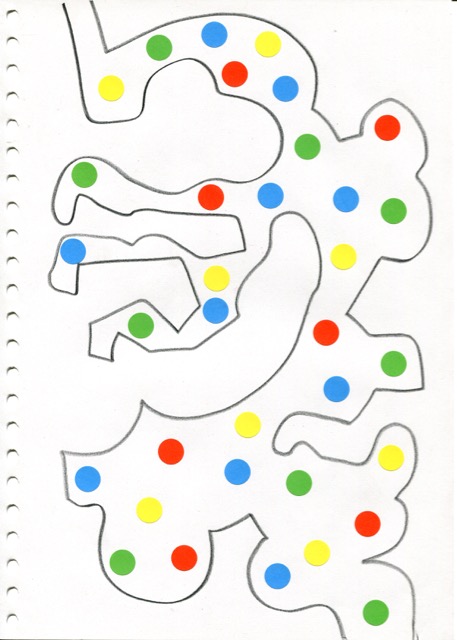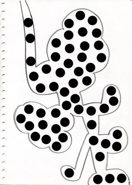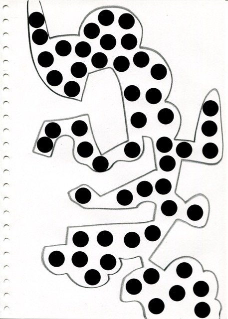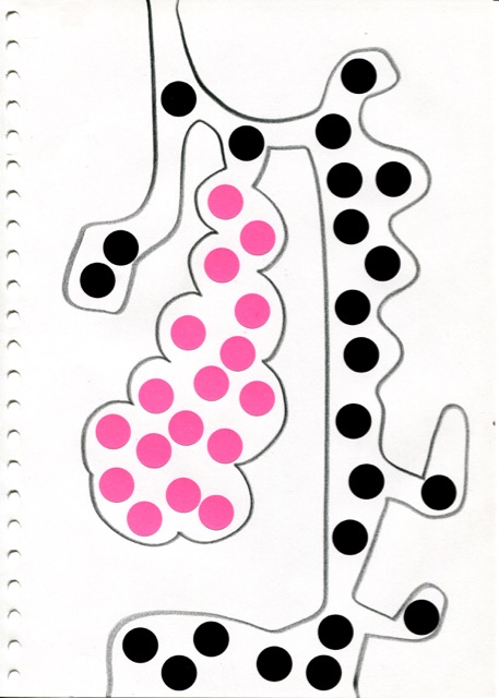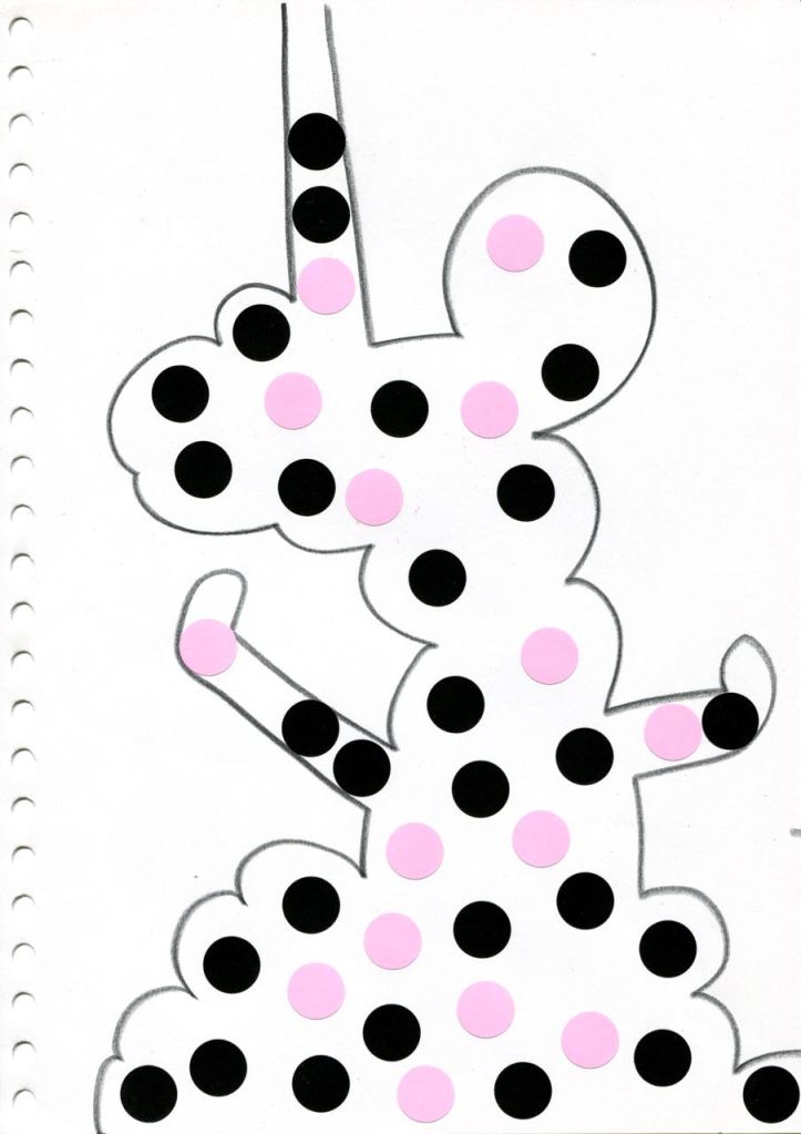 dessins à la mine noire sur papier et gommettes