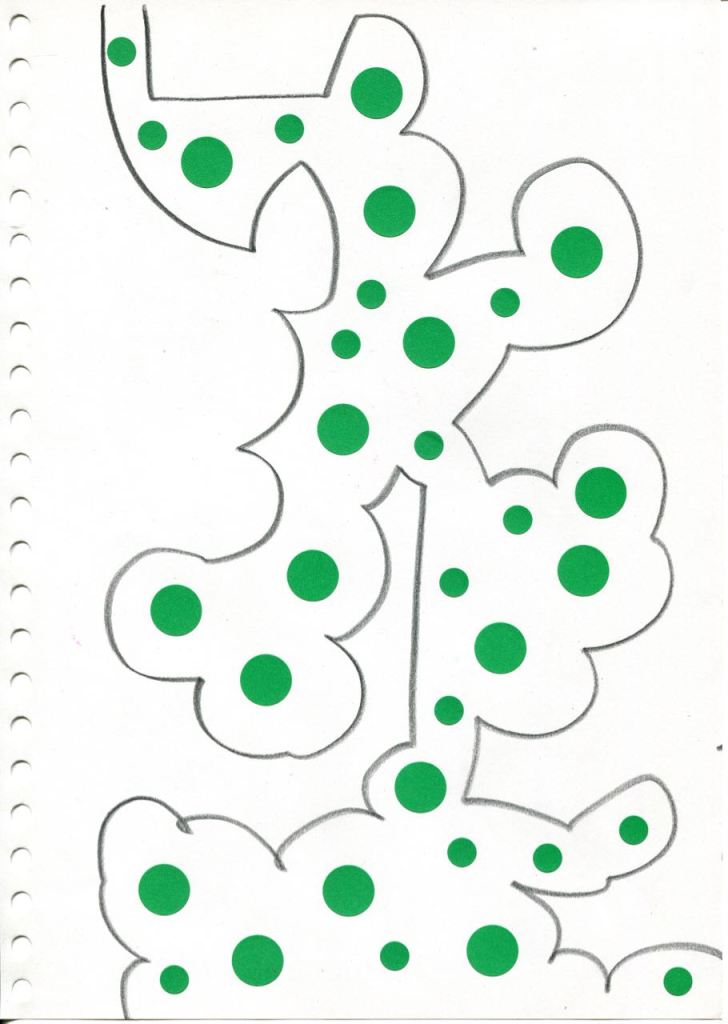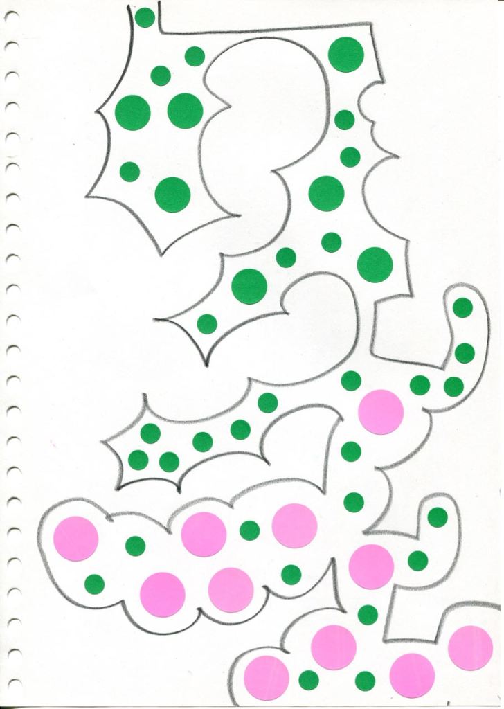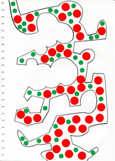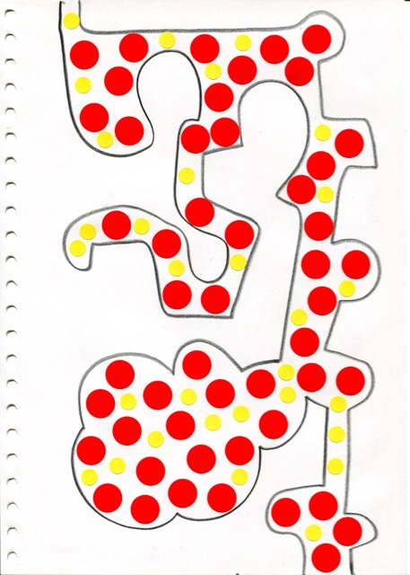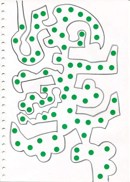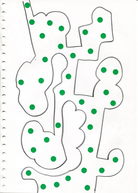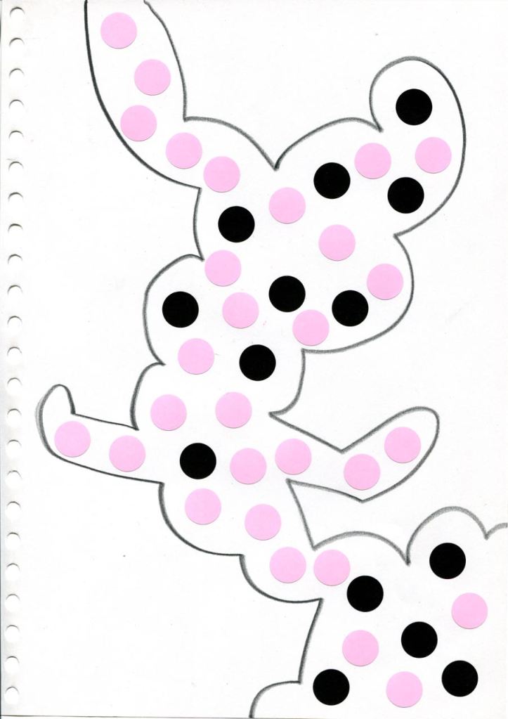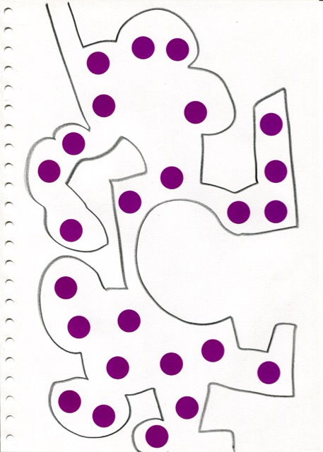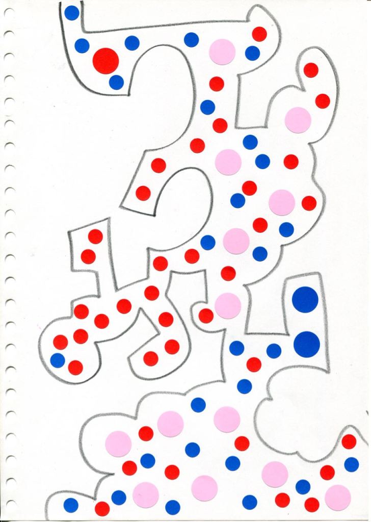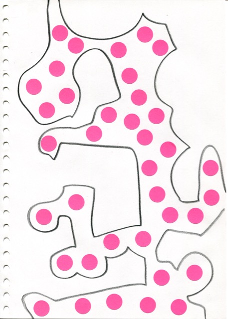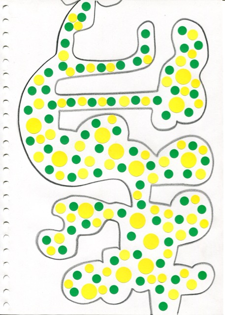 dessins à la mine noire sur papier et gommettes