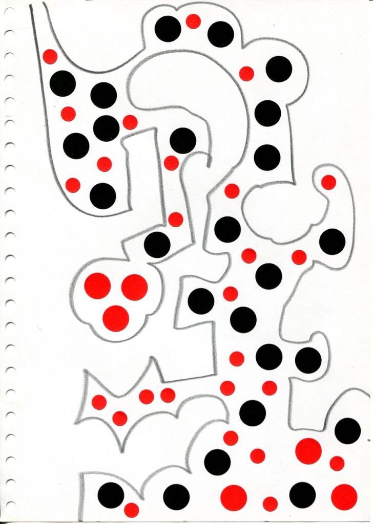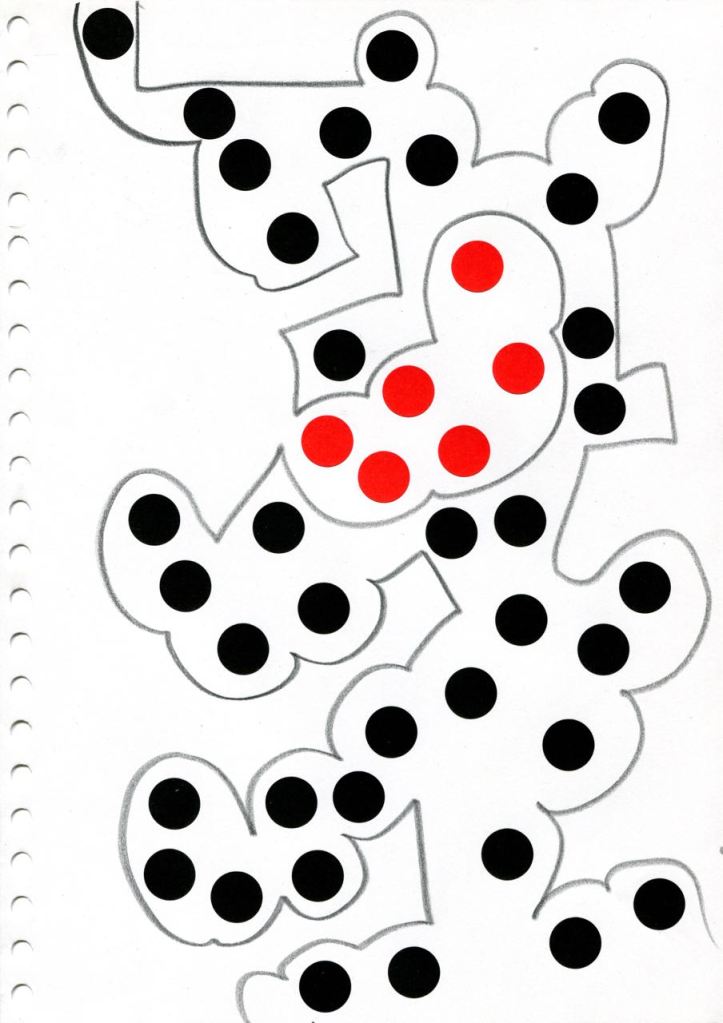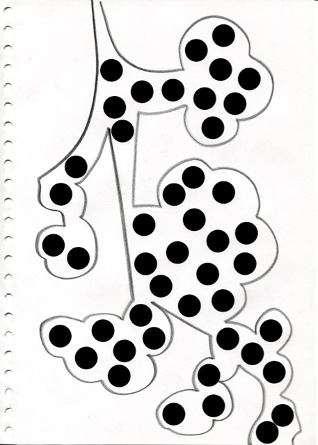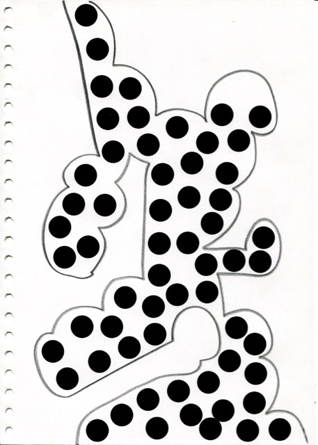 série de dessins à la mine noire et gommettes