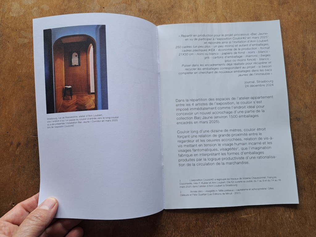 Cet ouvrage fait suite à la présentation de l’installation BAC JAUNE / CORRIDOR pour l’exposition collective Couloir#2 organisée par Ann Loubert dans son atelier à Strasbourg en mars 2025