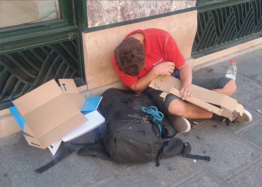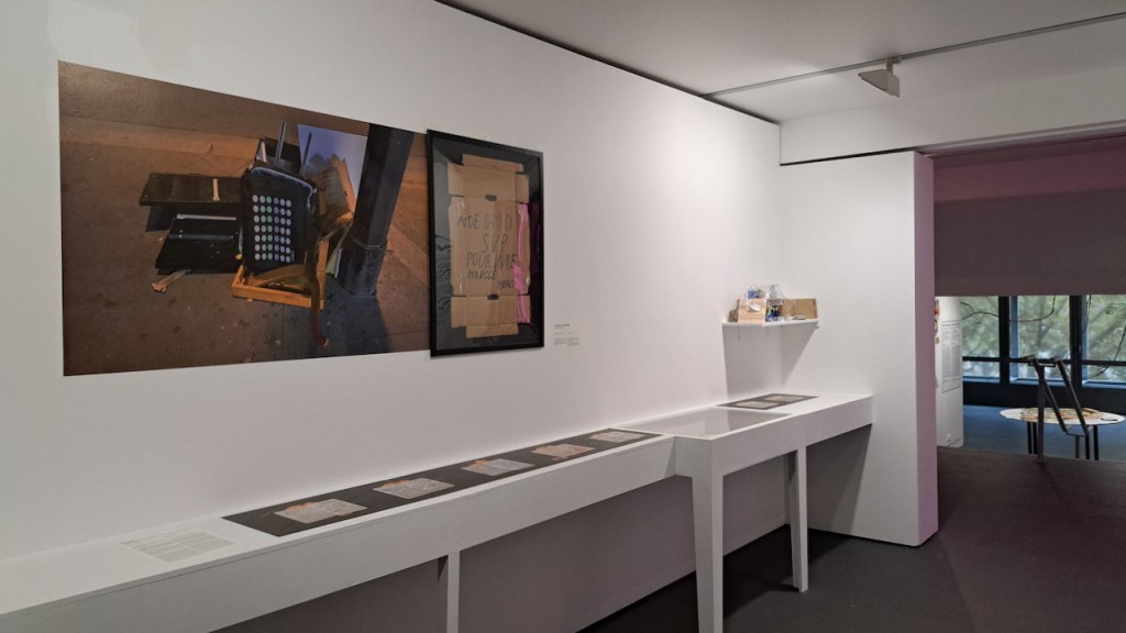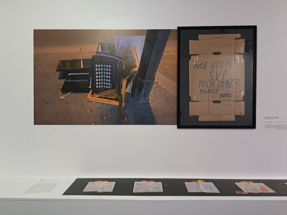 Un matin très tôt poursuivant mes recherches sur l’usage des emballages carton par les personnes à la rue, à l’heure du grand nettoyage urbain un message de détresse enfoui dans un tas de déchets attire son regard. Le téléphone saisit la scène, la main extrait l’objet témoin d’un possible naufrage.
