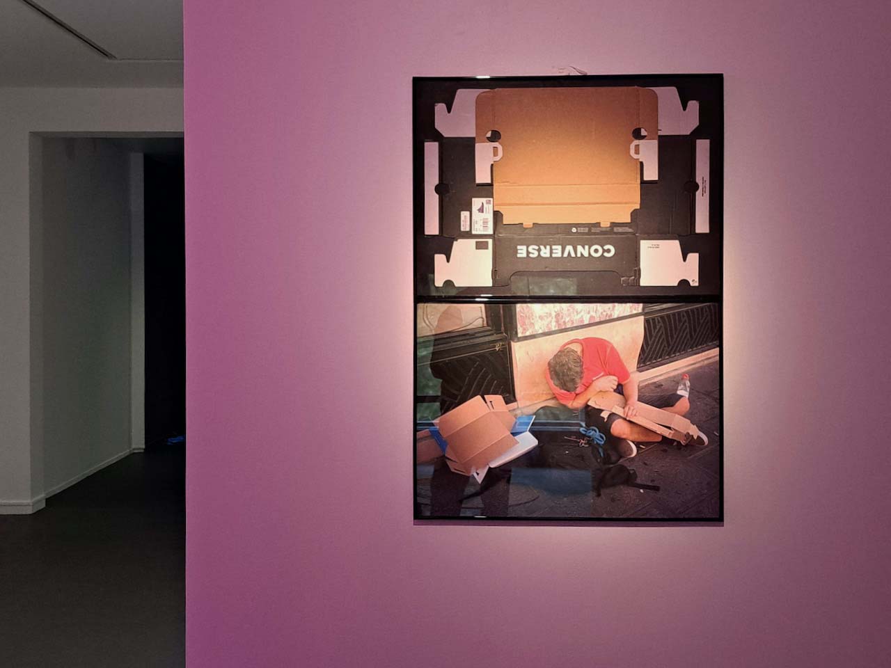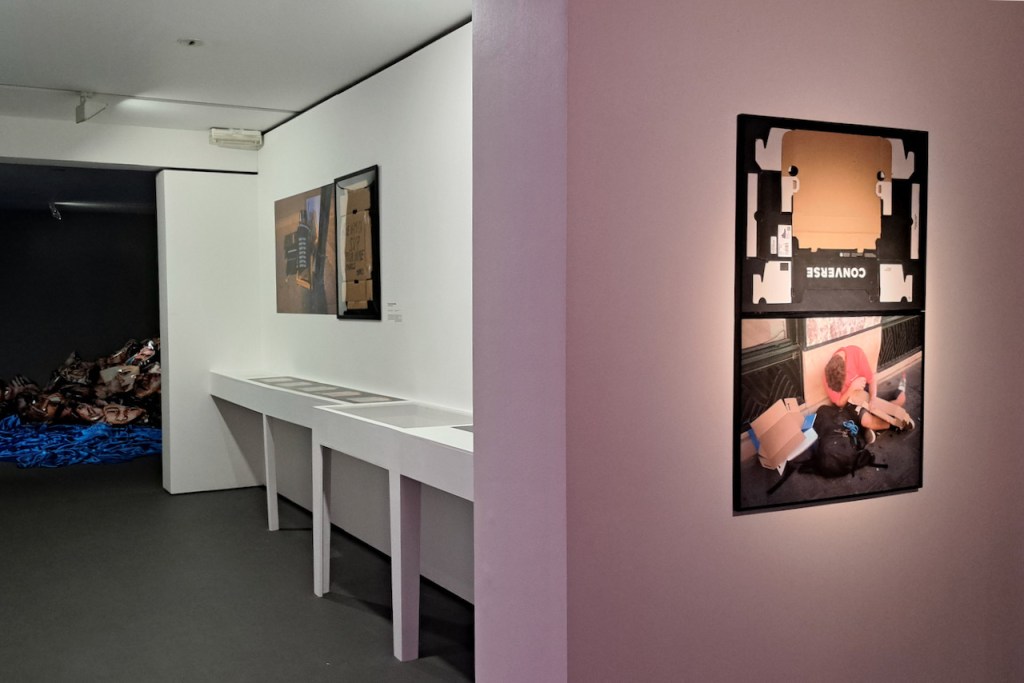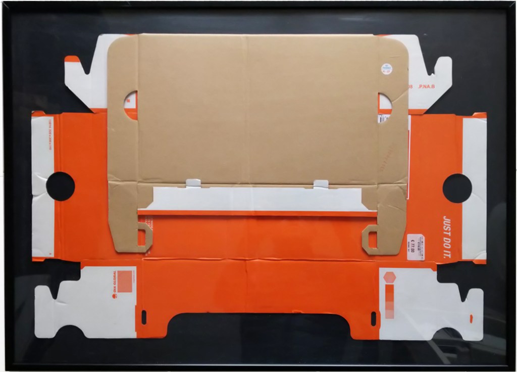 En documentant l’usage des emballages en carton par les personnes à la rue, je croise le long d’un grand magasin de la rue de Rivoli un homme épuisé tenant dans ses bras une boîte à chaussures de sport dépliée. Cette rencontre tragique entre performance et relégation dont est victime cette personne ramène à une série ancienne de figures totémiques produites par des emballages de chaussures de sport fixés sous cadre. La photographie et l’objet sont alors mis en relation à travers un faisceau de connexions imaginaires.